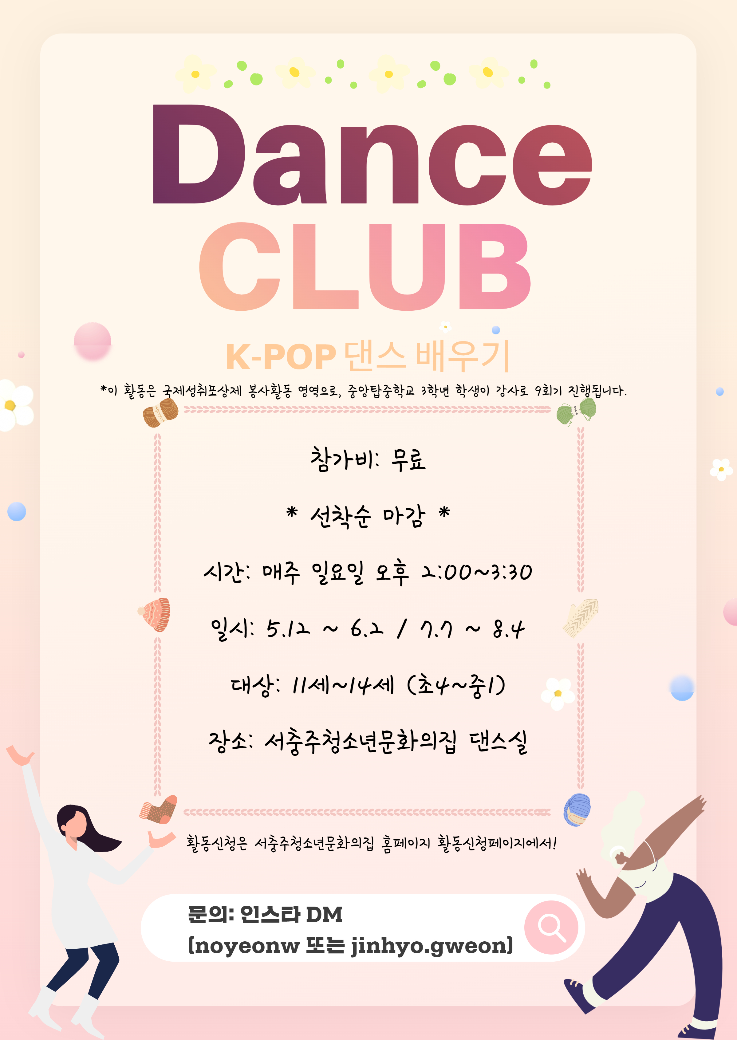 최신유행 k-pop댄스 배우기 *이 활동은 청소년국제성취포상제 봉사활동 영역으로 중앙탑중학교 3학년 학생들이 강사로 9회기 활동으로 진행됩니다. |