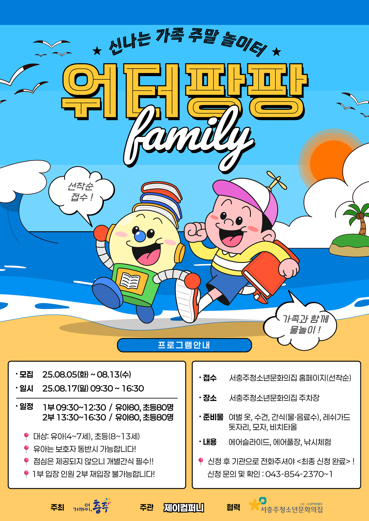 안녕하세요 서충주청소년문화의집입니다! 청소년들이 건강하고 알찬 방학을 보낼 수 있도록 준비한 특별 이벤트 바로바로~ 가족 물놀이!! ✨ ✔ 일자: 2025. 08. 17.(일) 09:30~12:30 ✔ 모집기간: 2025. 08. 05.(화) ~ 08.13.(수)까지 ✔ 대상: 4세~13세(유아는 보호자 동반 시 입장 가능) ✔ 장소: 서충주청소년문화의집 뒷편 (주차는 서충주국민체육센터 주차장을 이용바랍니다) ✔ 신청: 서충주청소년문화의집 홈페이지 ✔ 기타: 시내권 거주 청소년은 우선순위에서 제외됩니다 ***** 필독 ***** - 신청은 반드시 "청소년"의 이름과 연령대로 신청해주셔야 승인이 완료됩니다 - 신청시간에 참여 인원수를 작성해주세요 (성인제외) - 물놀이 참가 도중 서청문 시설 이용은 불가합니다 - 깨끗하고 안전한 물놀이를 위하여 음식물(라면, 김밥 등)은 반입이 불가합니다. 반드시 간단한 간식만 지참 부탁드립니다 ! - 기타 문의사항은 043-854-2370~1로 전화바랍니다 :) |