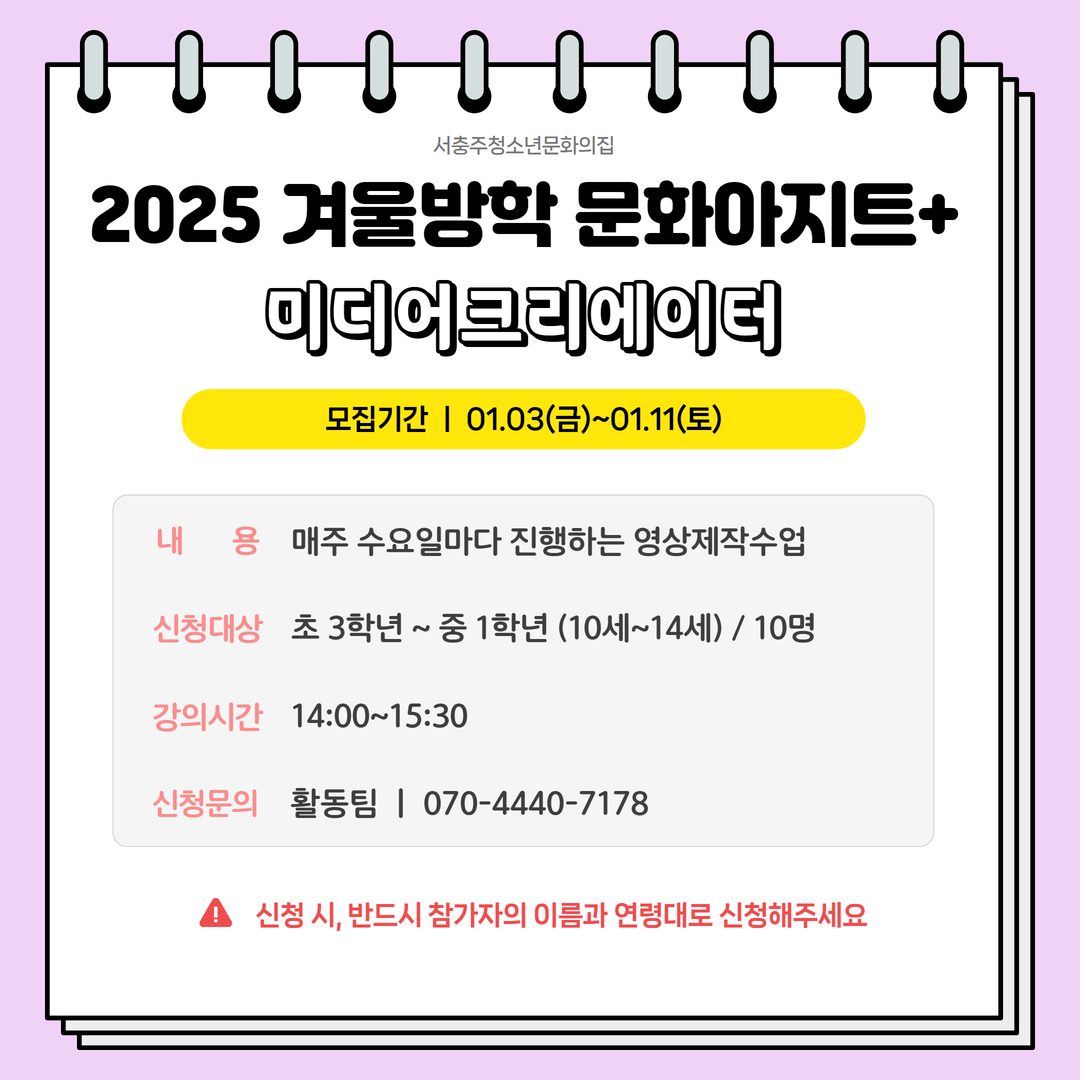 - 프로그램 신청 시, 청소년의 이름으로 신청해주셔야 확인이 더 빠릅니다.