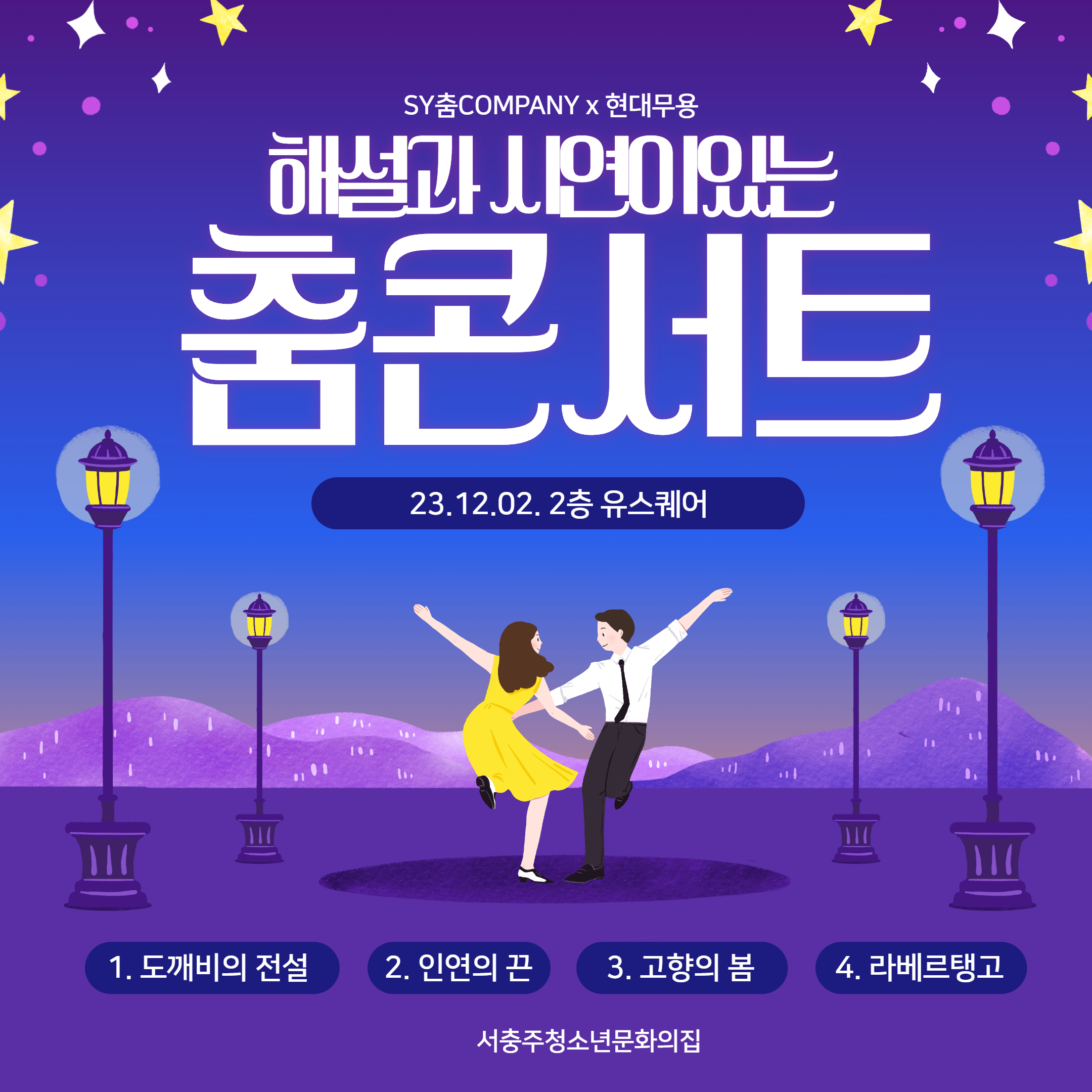 프로그램명 2023 충북문화재단 협력사업 "해설과 시연이있는 춤콘서트" 교육기간 2023-12-02 ~ 2023-12-02 / 토 / 15:00~16:30 접수기간 [ 온라인 / 선착순 ] 2023-11-22 00:00 ~ 2023-12-01 00:00 모집연령 및 정원 1 ~ 60세 / 청소년가족 누구나 / 40명 (예비 10명) 프로그램문의 043-854-2371 수업 내용 문화공연관람해설과 시연이 있는 춤콘서트는 청소년 및 지역주민들이 현대무용을 쉽게 이해할수있도록 만든 스토리있는 공연 첨부파일 춤콘서트홍보지1.jpg [ Size : 2.04MB, Down : 88 ] 미리보기 다운로드 춤콘서트홍보지2.jpg [ Size : 2.54MB, Down : 97 ] 미리보기 다운로드 ※ 프로그램 신청 시 대상연령 확인 후 관리자 승인까지 완료되어야 프로그램 신청인원으로 카운트됩니다. 신청확인 목록보기