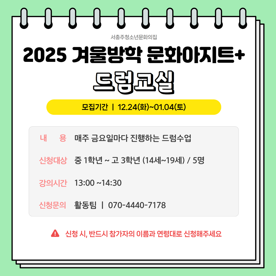 프로그램명 | 2025 겨울방학 문화아지트+ "드럼교실" |