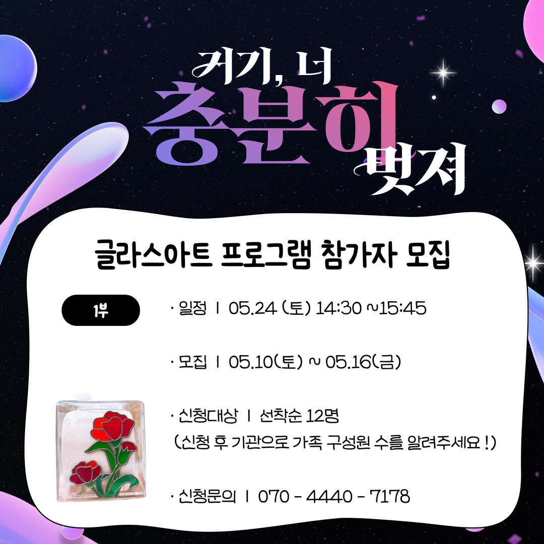 프로그램명 2025 거기 너, 충분히 멋져 "글라스아트 프로그램 참가자 모집 (1부)" 교육기간 2025-05-24 ~ 2025-05-24 / 토 / 14:30~15:45 접수기간 [ 온라인 / 선착순 ] 2025-05-10 09:29 ~ 2025-05-21 23:59 모집연령 및 정원 8 ~ 24세 결과발표회 참가자 가족 우선 / 6명 (예비 1명) 프로그램문의 070-4440-7178 수업 내용 안녕하세요 서충주청소년문화의집입니다 ! 05.24 (토) 가정의 달을 맞이하여공연 및 프로그램을 준비하게 되었습니다 ><✓ 일시 : 05. 24 (토) / 14:30 ~ 15:45✓ 장소 : 서충주청소년문화의집 2층✓ 신청대상 : 청소년 가족 선착순 12명* 신청 후 기관으로 가족 구성원 수를 알려주세요 !* 공지사항 *- 신청은 반드시 참가자(청소년)의 이름과 연령대로 신청 바랍니다.많은 참가 부탁드립니다 ~!! 첨부파일 3.png [ Size : 851.4KB, Down : 39 ] 미리보기 다운로드 ※ 프로그램 신청 시 대상연령 확인 후 관리자 승인까지 완료되어야 프로그램 신청인원으로 카운트됩니다. 신청확인 목록보기