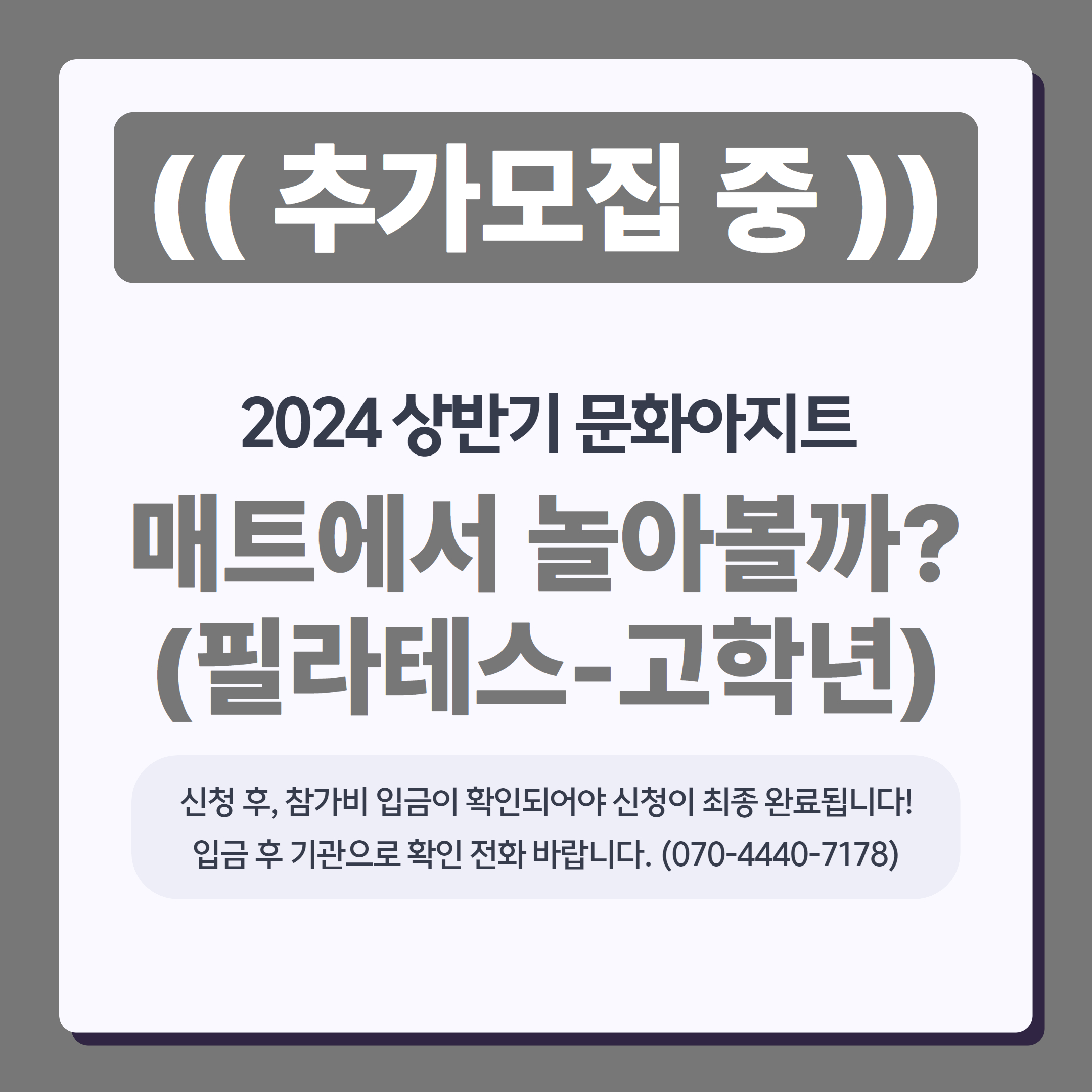 | 프로그램명 | 2024 상반기문화아지트 <매트에서 놀아볼까?-고학년(필라테스)> |