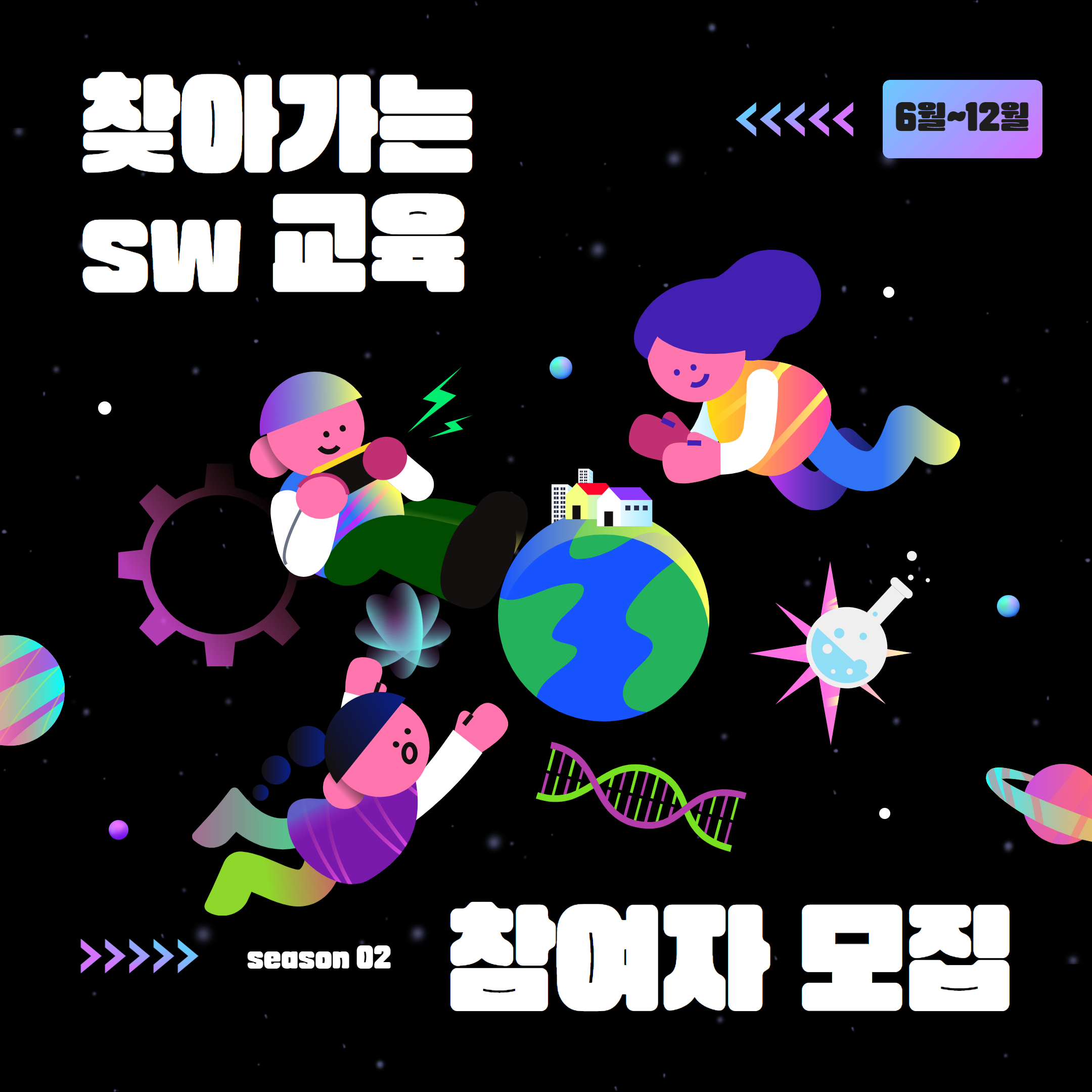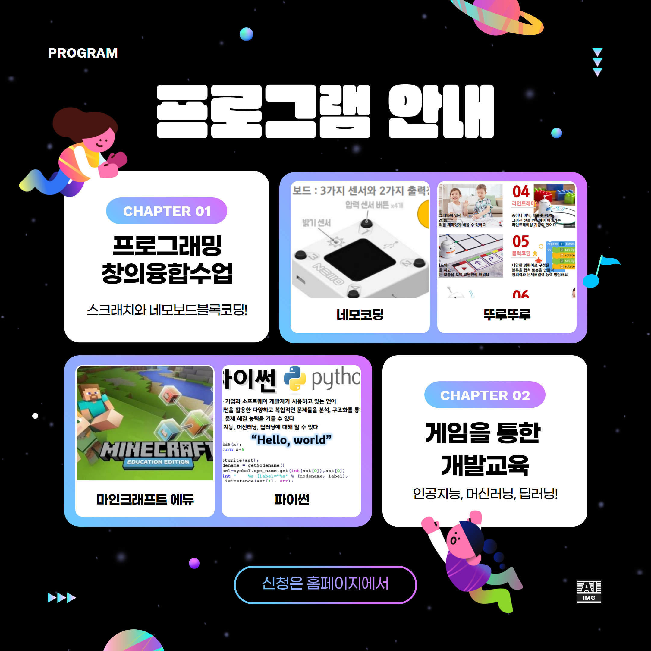 프로그램명 2024년 협력사업 찾아가는 SW교육(11세~13세) 교육기간 2024-06-11 ~ 2024-12-10 / 화 / 15:30~17:00 / 10:30~12:00 접수기간 [ 온라인 / 선착순 ] 2024-05-23 00:00 ~ 2024-06-10 00:00 모집연령 및 정원 11 ~ 13세 / 초4~초6 / 10명 (예비 1명) 프로그램문의 043-854-2371(담당자 양유진) 수업 내용 6월11일부터 12월10일 매주 화요일 총26회기로 진행되는 sw교육!방학 전에는 6월11일~7월23일 15:30~17:00 / 방학 후 7월30일~8월13일에는 10:30~12:00에 진행됩니다:)sw교육은 충북미래채움에서 진행되며 네모코딩, 뚜루뚜루, 마인크래프트 에듀, 파이썬 등 다양한 프로그램을 진행합니다. 첨부파일 제목을 입력하세요 1.jpg [ Size : 1.01MB, Down : 81 ] 미리보기 다운로드 제목을 입력하세요 2.jpg [ Size : 1.32MB, Down : 104 ] 미리보기 다운로드 제목을 입력하세요 3.jpg [ Size : 1.32MB, Down : 83 ] 미리보기 다운로드 ※ 프로그램 신청 시 대상연령 확인 후 관리자 승인까지 완료되어야 프로그램 신청인원으로 카운트됩니다. 신청확인 목록보기