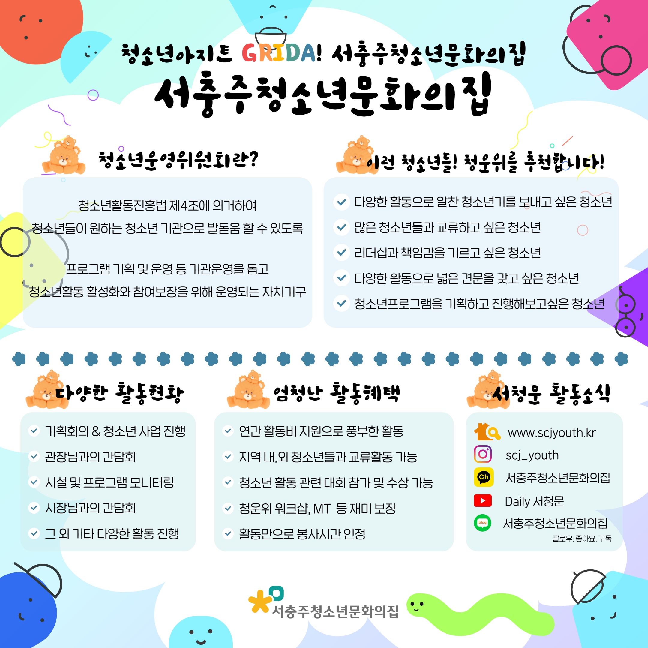 프로그램명 2024 서충주청소년문화의집 "청소년운영위원회" 1기 모집(방문 또는 이메일제출) 교육기간 2024-01-01 ~ 2024-12-31 / 토 / - 접수기간 [ 온라인+방문 / 선착순 ] 2023-11-25 00:00 ~ 2023-12-31 00:00 모집연령 및 정원 13 ~ 24세 / 초6~ 대학생 / 15명 (예비 5명) 프로그램문의 043-854-2371 수업 내용 1. 청소년운영위원회는 문화의집 운영을 돕는 청소년 자치기구 입니다.2. 주요활동 1) 월별정기회의 2) 워크샵 및 MT 3) 프로그램 기획 및 진행 4) 기관 운영이 잘되고 있는지 모니터링(시설, 프로그램) 5) 자치기구 연합활동 및 회의 6) 기관장 간담회 7) 그 외 함께 하고싶은 모든 활동 오케이!(신청서는 첨부파일 확인) 첨부파일 청운위모집 1(정방향).jpg [ Size : 930.07KB, Down : 96 ] 미리보기 다운로드 청운위모집 2(정방향).jpg [ Size : 1.19MB, Down : 119 ] 미리보기 다운로드 제1기 청소년운영위원회 신청서.hwp [ Size : 171.5KB, Down : 167 ] 다운로드 ※ 프로그램 신청 시 대상연령 확인 후 관리자 승인까지 완료되어야 프로그램 신청인원으로 카운트됩니다. 신청확인 목록보기