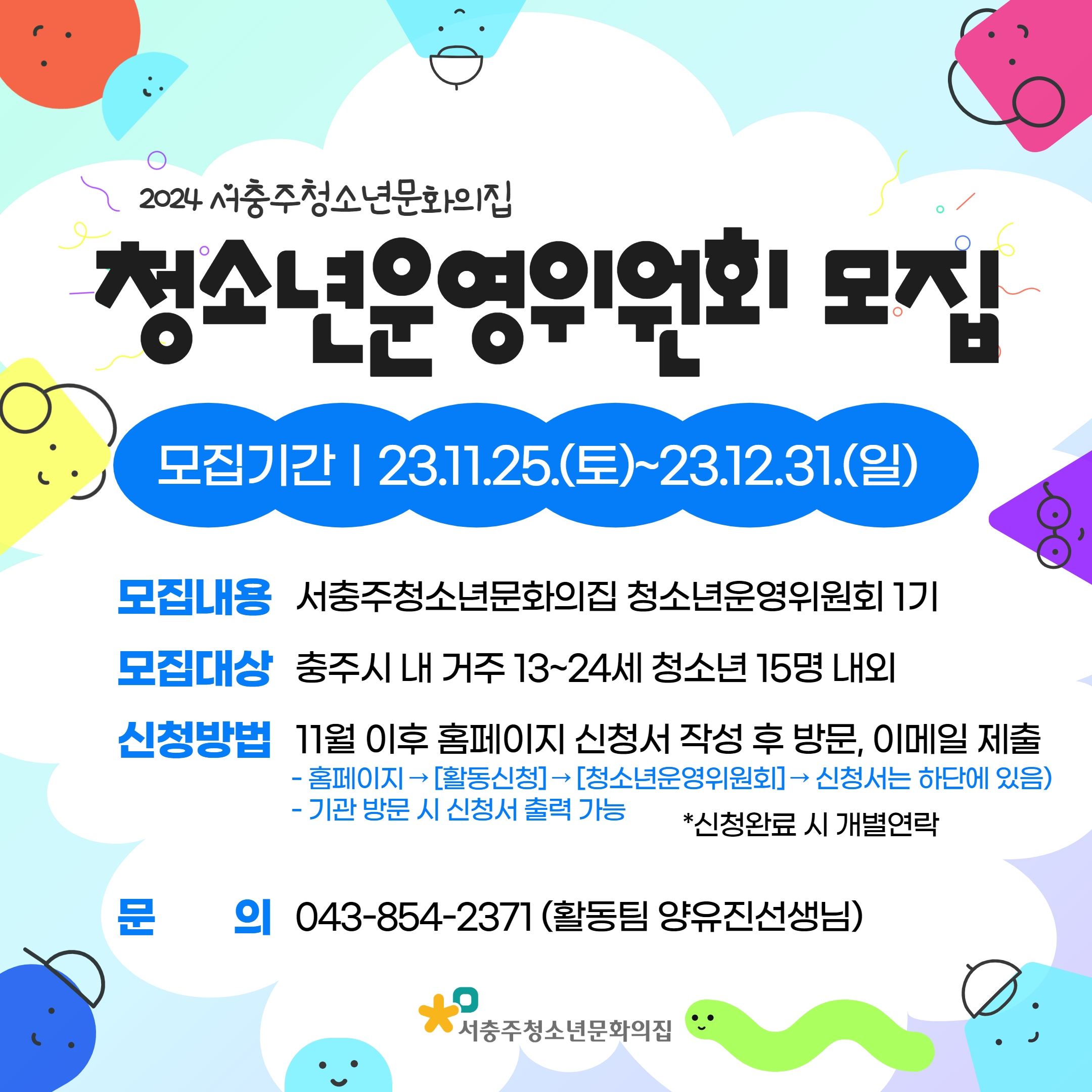 프로그램명 2024 서충주청소년문화의집 "청소년운영위원회" 1기 모집(방문 또는 이메일제출) 교육기간 2024-01-01 ~ 2024-12-31 / 토 / - 접수기간 [ 온라인+방문 / 선착순 ] 2023-11-25 00:00 ~ 2023-12-31 00:00 모집연령 및 정원 13 ~ 24세 / 초6~ 대학생 / 15명 (예비 5명) 프로그램문의 043-854-2371 수업 내용 1. 청소년운영위원회는 문화의집 운영을 돕는 청소년 자치기구 입니다.2. 주요활동 1) 월별정기회의 2) 워크샵 및 MT 3) 프로그램 기획 및 진행 4) 기관 운영이 잘되고 있는지 모니터링(시설, 프로그램) 5) 자치기구 연합활동 및 회의 6) 기관장 간담회 7) 그 외 함께 하고싶은 모든 활동 오케이!(신청서는 첨부파일 확인) 첨부파일 청운위모집 1(정방향).jpg [ Size : 930.07KB, Down : 102 ] 미리보기 다운로드 청운위모집 2(정방향).jpg [ Size : 1.19MB, Down : 124 ] 미리보기 다운로드 제1기 청소년운영위원회 신청서.hwp [ Size : 171.5KB, Down : 174 ] 다운로드 ※ 프로그램 신청 시 대상연령 확인 후 관리자 승인까지 완료되어야 프로그램 신청인원으로 카운트됩니다. 신청확인 목록보기