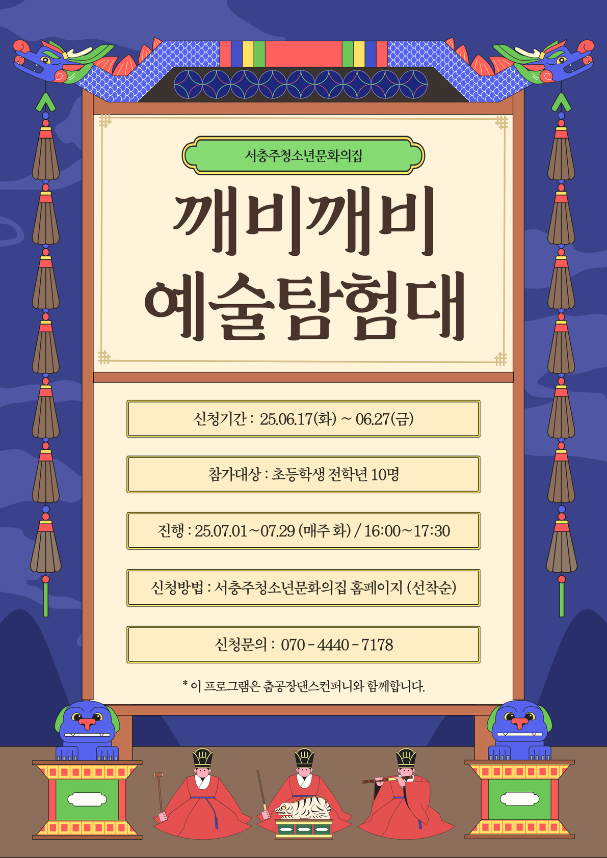 2025 지역연계사업 깨비깨비 예술탐험대 * 수업 일정 - 1회기: 07.01 (화) - 2회기: 07.08 (화) - 3회기: 07.15 (화) - 4회기: 07.22 (화) - 5회기: 07.29 (화) * 수업 안내 - 무용을 기반으로 다양한 예술장르를 융복합한 예술 창의 체험 교육 프로그램 - 초등학교 고학년(4학년~6학년) 청소년이 우선순위로 승인됩니다. ***** 필독 ***** - 신청은 반드시 참가자의 이름과 나이로 신청 부탁드립니다. - 무단결석 3회 시 다른 프로그램에서 제외될 수 있습니다. - 참가자 정원 60% 미만 시, 폐강될 수 있습니다. |