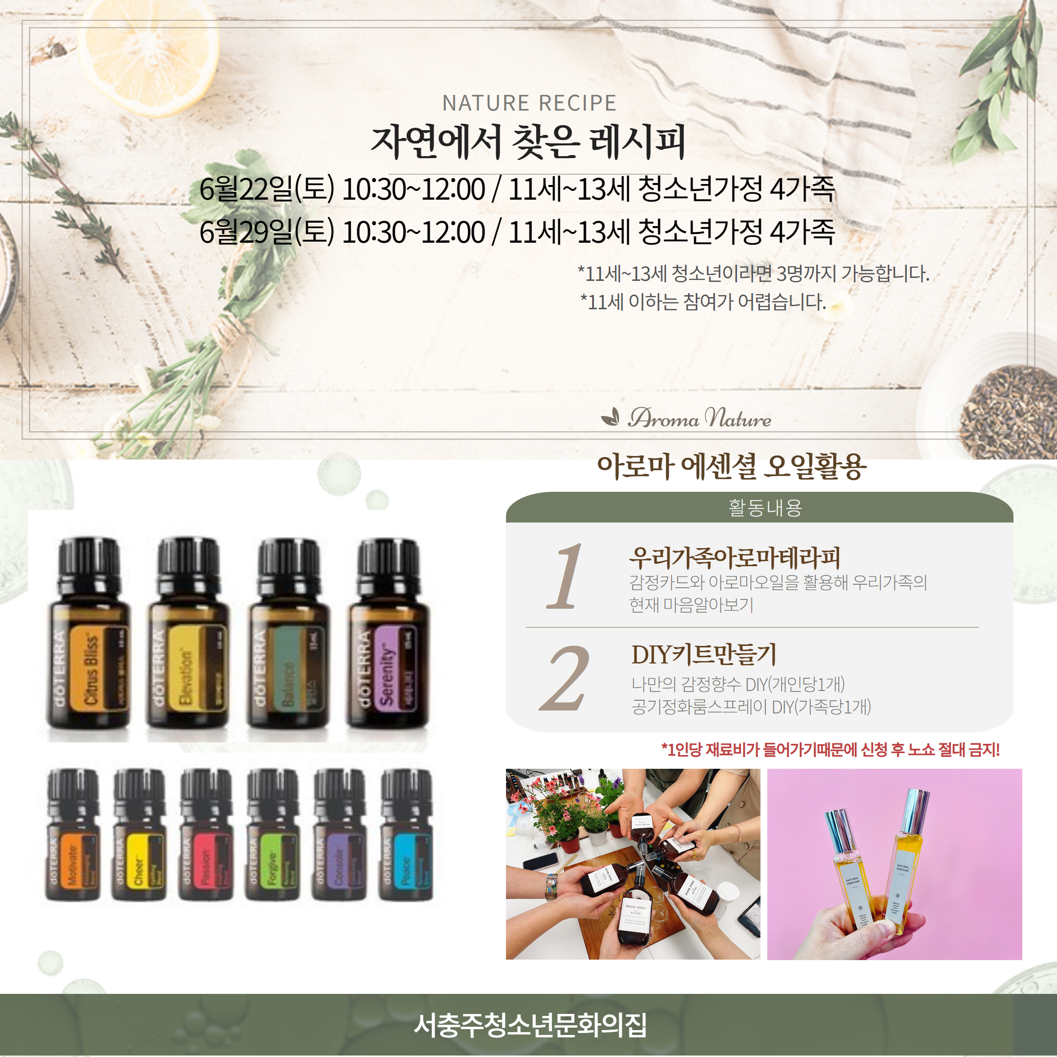 프로그램명 가족특별pg 우리가족아로마힐링테라피(22일: 11세~13세 청소년가족 대상) 교육기간 2024-06-22 ~ 2024-06-22 / 토 / 10:30~12:00 접수기간 [ 온라인 / 선착순 ] 2024-06-15 00:00 ~ 2024-06-20 00:00 모집연령 및 정원 11 ~ 13세 / 초4~초6 / 4명 (예비 1명) 프로그램문의 043-854-2371(담당자 양유진) 수업 내용 프로그램 내용의 수준상 11세~13세 청소년이 포함된 가족만 신청가능 합니다:)동생이 있다고 해도 11세 이하는 참여 자체가 불가합니다ㅠㅠ 양해부탁드립니다.또한, 프로그램은 무료지만 1인당 재료비가 들어가기때문에 신청 후 노쇼는 절대 금지입니다! 첨부파일 제목을 입력하세요 1.jpg [ Size : 1.36MB, Down : 76 ] 미리보기 다운로드 제목을 입력하세요 2.jpg [ Size : 2.56MB, Down : 111 ] 미리보기 다운로드 ※ 프로그램 신청 시 대상연령 확인 후 관리자 승인까지 완료되어야 프로그램 신청인원으로 카운트됩니다. 신청확인 목록보기