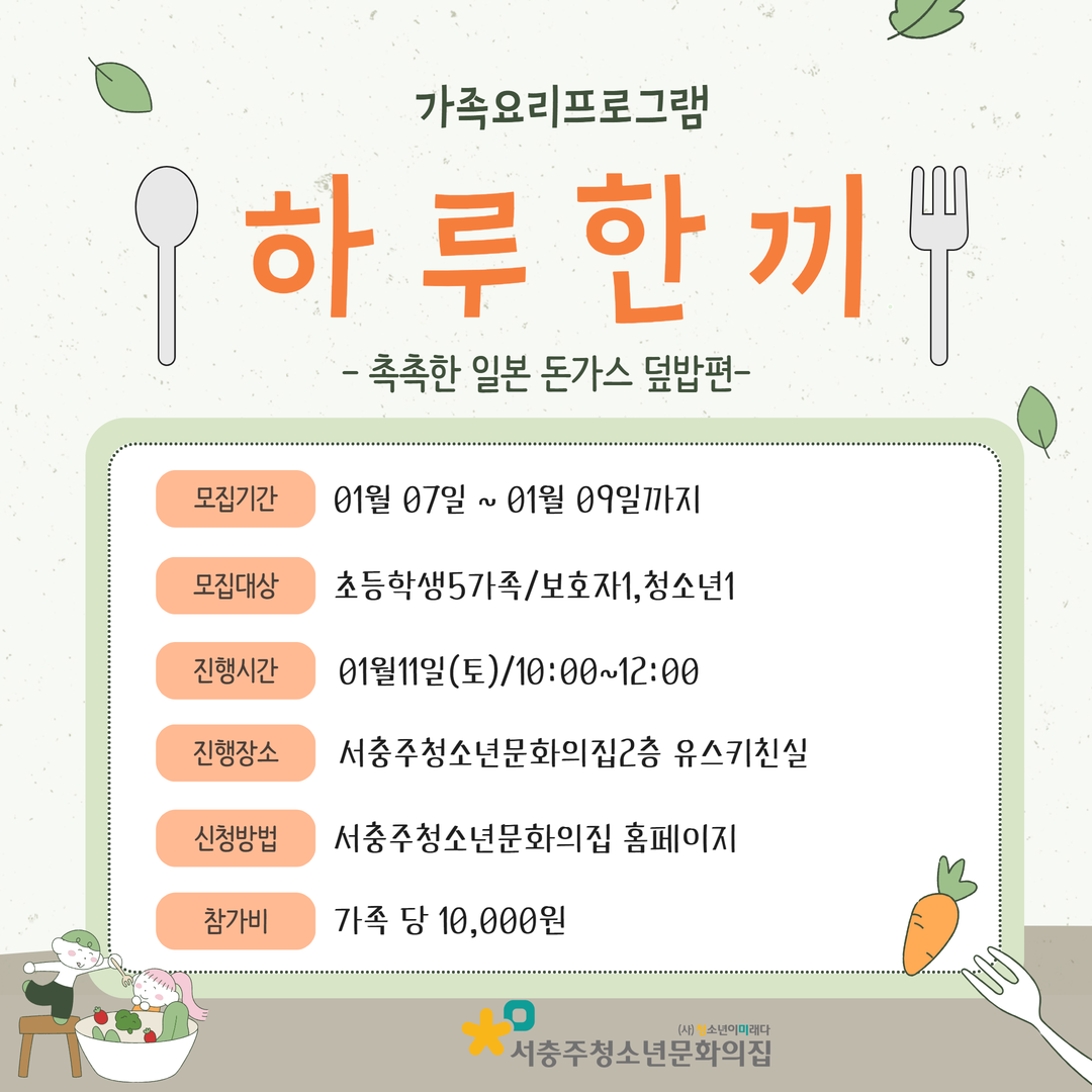 | 수업 내용 | 안녕하세요 서충주청소년문화의집입니다! 2025 겨울방학 문화아지트+  이번에는 - 촉촉한 일본 돈가스 덮밥편 - 을 진행합니다. ✔ 일자: 2025. 01. 11.(토) 10:00~12:00 ✔ 모집: 2025. 01. 07.(화) ~ 09.(목)까지 ✔ 대상: 총 5가족(보호자 1명+청소년 1명씩 짝을 이뤄 5가족! 입니다!) ✔ 장소: 서충주청소년문화의집 2층 유스키친실 ✔ 내용: 촉촉한 일본 돈가스 덮밥 ✔ 참가비 : 가족 당 10,000원(농협/301-0331-2232-01/서충주청소년문화의집) ***** 필독 ***** - 참가비: 가족 당 10,000원 (1회기) - 참가비 입금 계좌: 농협/301-0331-2232-01/서충주청소년문화의집 - 신청과 입금 후 기관으로 전화를 주셔야 <최종 신청 완료>됩니다! - 입금 후에는 환불이 어려우니 신중하게 고민 후 신청해주세요! - 입금은 신청자(청소년) 이름으로 입금해주셔야 확인이 더 빠릅니다! - 원활한 입금 확인을 위하여 입금 후, 070-4440-7178로 전화바랍니다! |