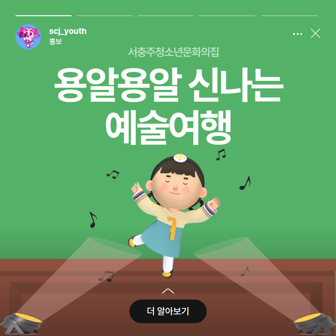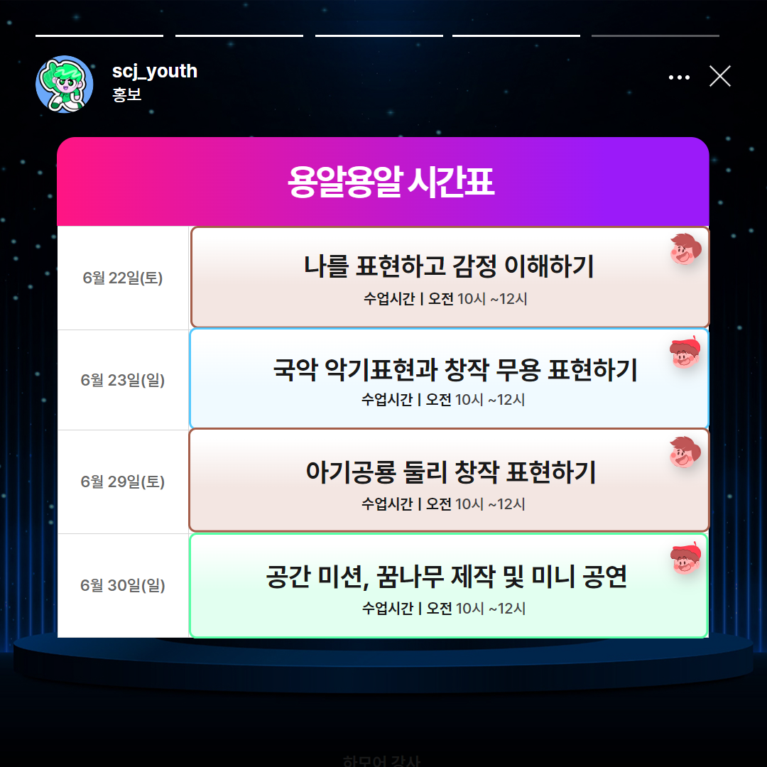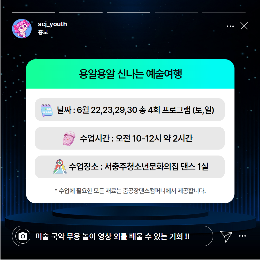 프로그램명 2024년 지역연계사업 용알용알 신나는 예술여행 교육기간 2024-06-22 ~ 2024-06-30 / 토, 일 / 10:00~12:00 접수기간 [ 온라인 / 선착순 ] 2024-06-05 00:00 ~ 2024-06-20 00:00 모집연령 및 정원 8 ~ 10세 초1~초3 / 10명 (예비 5명) 프로그램문의 010-3319-3211 수업 내용 춤공장댄스컴퍼니에서 진행하는 "용알용알 신나는 예술여행" 친구들이 평소 배워보기 어려웠던 무용을 배워볼 수 있는총 4회기 예술통합프로그램입니다~!! 많은 참여 부탁드립니다❤*10명 이상의 예비인원 친구들은 21,22,28,29 / 금,토 14:00~16:00 체육센터에서 수강가능합니다 !!문의사항 : 010-3319-3211로 연락주세요 :) 첨부파일 1.png [ Size : 288.59KB, Down : 91 ] 미리보기 다운로드 2.png [ Size : 530.1KB, Down : 116 ] 미리보기 다운로드 3.png [ Size : 525.85KB, Down : 104 ] 미리보기 다운로드 4.png [ Size : 460.68KB, Down : 124 ] 미리보기 다운로드 5.png [ Size : 492.34KB, Down : 110 ] 미리보기 다운로드 ※ 프로그램 신청 시 대상연령 확인 후 관리자 승인까지 완료되어야 프로그램 신청인원으로 카운트됩니다. 신청확인 목록보기