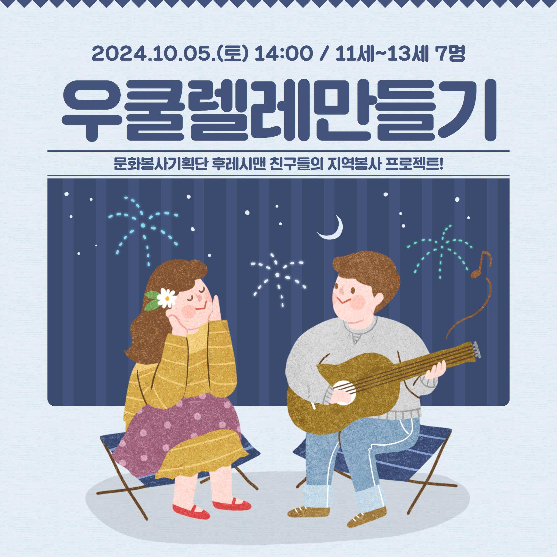 프로그램명 문화봉사기획단 후레시맨 기획프로그램 "우쿨렐레만들기" 교육기간 2024-10-05 ~ 2024-10-05 / 토 / 14:00~15:30 접수기간 [ 온라인 / 선착순 ] 2024-09-26 00:00 ~ 2024-10-03 00:00 모집연령 및 정원 11 ~ 13세 / 초4~초6 / 7명 (예비 1명) 프로그램문의 043-854-2371 수업 내용 문화봉사기획단 후레시맨 친구들이 기획운영하는 우클렐레만들기입니다!시간이 되면 만들고나서 연주도 배워보는 시간을 가지려합니다:) 첨부파일 제목을 입력하세요.jpg [ Size : 1.83MB, Down : 88 ] 미리보기 다운로드 ※ 프로그램 신청 시 대상연령 확인 후 관리자 승인까지 완료되어야 프로그램 신청인원으로 카운트됩니다. 신청확인 목록보기