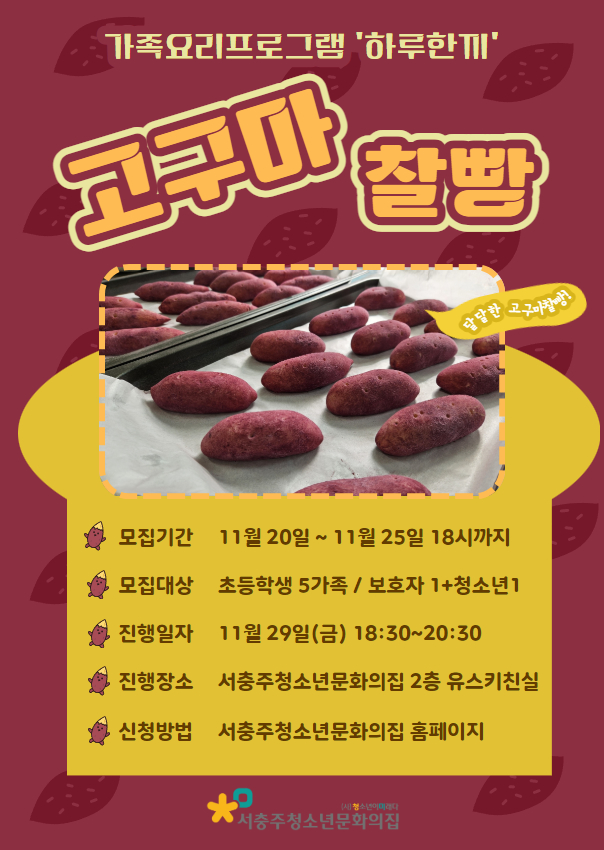 안녕하세요 서충주청소년문화의집입니다! 지난달 가족요리프로그램 - 수제에너지바편 -을 이어, 이번에는 - 고구마찰빵편 - 을 진행합니다. ✔ 일자: 2024. 11. 29.(금) 18:30~20:30 ✔ 모집: 2024. 11. 20.(수) ~ 25.(월) 18:00 까지 ✔ 대상: 총 5가족(보호자 1명+청소년 1명씩 짝을 이뤄 5가족! 입니다!) ✔ 장소: 서충주청소년문화의집 2층 유스키친실 ✔ 내용: 가을엔 달달, 고구마찰빵