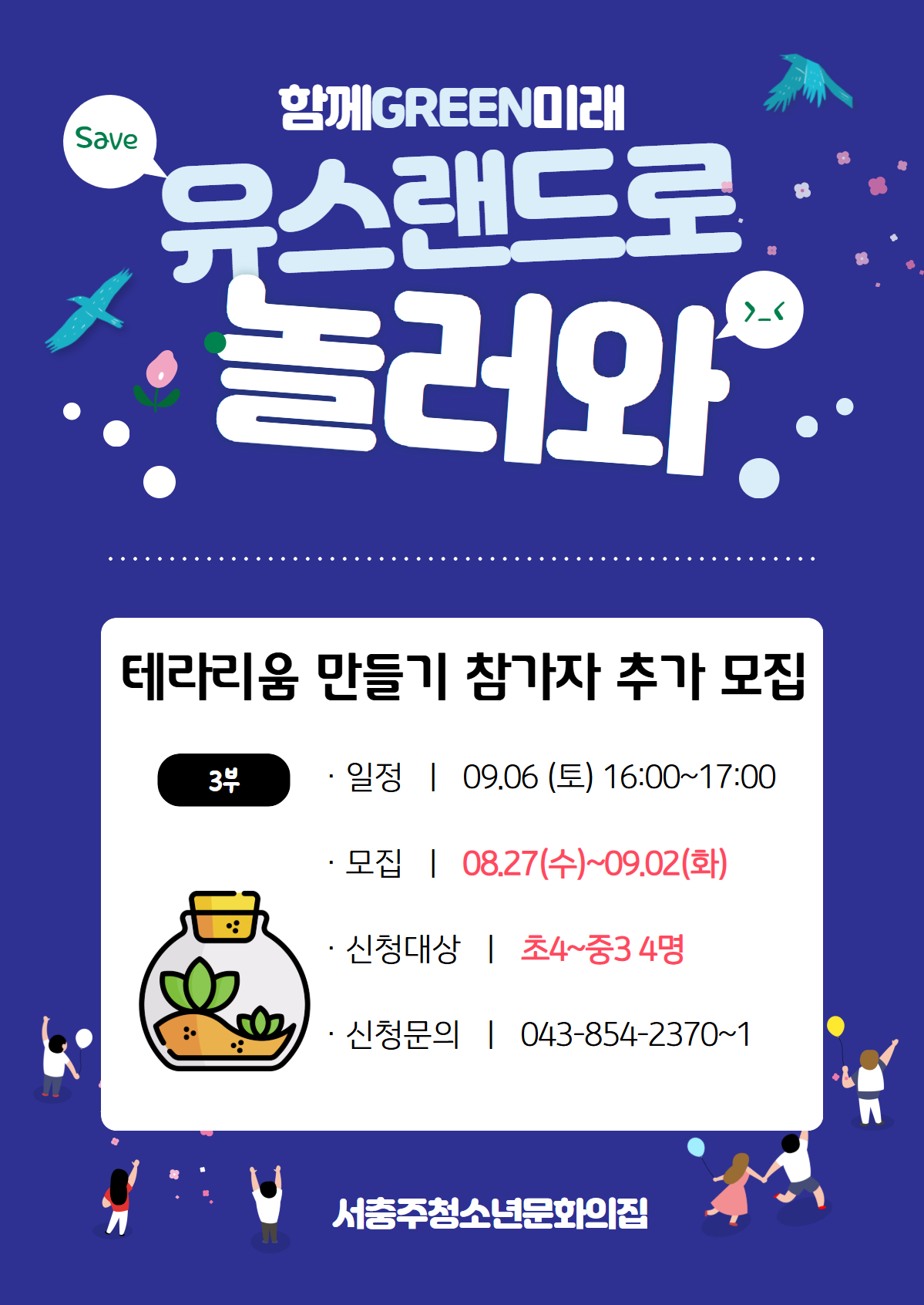 | 수업 내용 | 안녕하세요 서충주청소년문화의집입니다! 25년유스랜드로 놀러와 - 함께GREEN 미래- 테라리움 만들기(3부) 참가자를 추가 모집합니다~!!✨ ✔ 일자: 2025. 09. 06.(토) 16:00~17:00 ✔ 모집기간: 2025. 08. 27.(수) ~ 09.02.(화)까지 ✔ 대상: 초4~중3 / 4명 ✔ 장소: 서충주청소년문화의집 2층 ✔ 신청: 서충주청소년문화의집 홈페이지 ***** 필독 ***** - 신청은 반드시 참가자의 연령대로 신청해주셔야 승인이 완료됩니다 - 기타 문의사항은 043-854-2370~1로 전화바랍니다 :)
