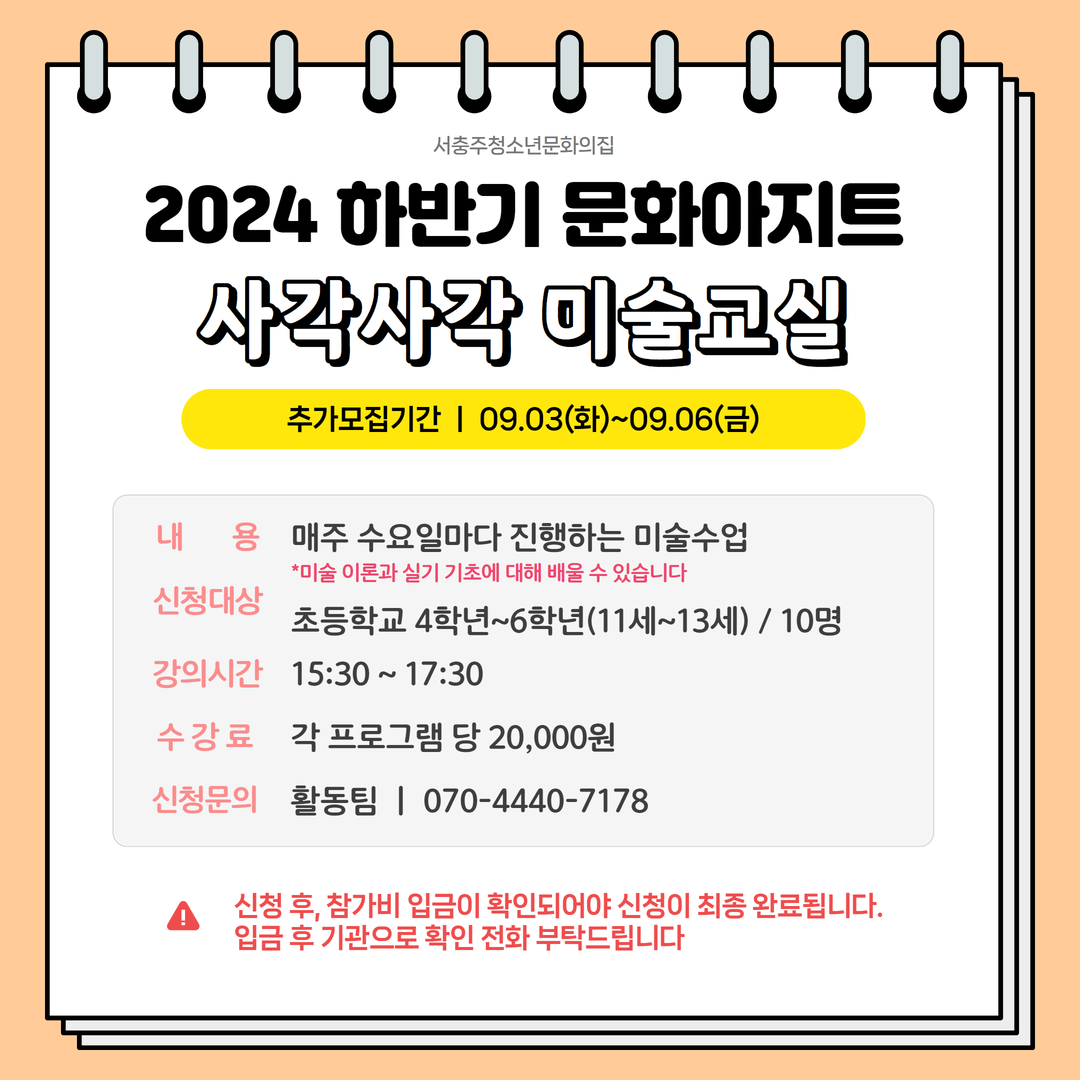 2024년도 하반기 문화아지트 <사각사각 미술교실(미술)>수업입니다 ! * 수업 일정 - 1회기: 09.11.(수) - 2회기: 09.25.(수) - 3회기: 10.02.(수) - 4회기: 10.16.(수) - 5회기: 10.23.(수) - 6회기: 10.30.(수) - 7회기: 11.06.(수) - 8회기: 11.13.(수) - 9회기: 11.20.(수) - 10회기: 11.27.(수) - 11회기: 12.04.(수) - 12회기: 12.11.(수) ***** 필독 ***** - 참가비: 20,000원 - 참가비 입금 계좌: 농협/301-0331-2232-01/서충주청소년문화의집 - 신청 후 입금이 완료되어야 <최종 신청 완료>됩니다! - 입금 후에는 환불이 어려우니 신중하게 고민 후 신청해주세요!(폐강 시에는 환불) - 입금은 신청자(청소년) 이름으로 입금해주셔야 확인이 더 빠릅니다! - 원활한 입금 확인을 위하여 입금 후, 070-4440-7178로 전화바랍니다! - 참가자 정원 60% 미만 시, 폐강될 수 있습니다. |