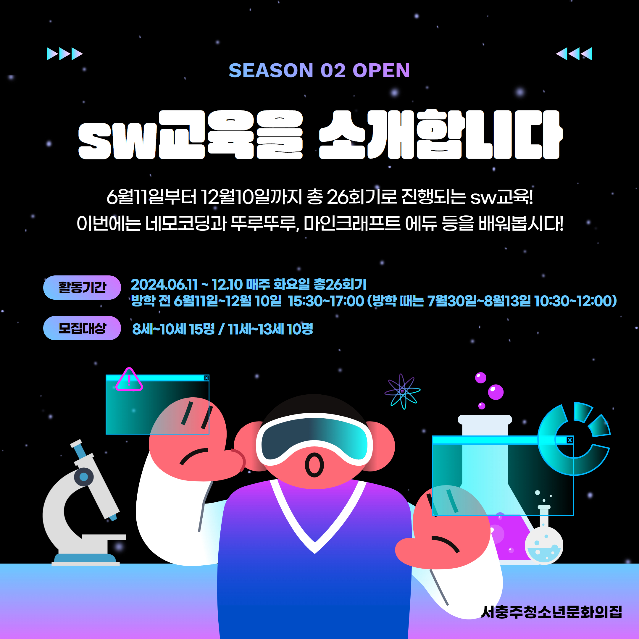프로그램명 2024년 협력사업 찾아가는 SW교육(8세~10세) 교육기간 2024-06-11 ~ 2024-12-10 / 화 / 15:30~17:00 / 10:30~12:00 접수기간 [ 온라인 / 선착순 ] 2024-05-23 00:00 ~ 2024-06-08 00:00 모집연령 및 정원 8 ~ 10세 / 초1~초3 / 15명 프로그램문의 043-854-2371(담당자 양유진) 수업 내용 6월11일부터 12월10일 매주 화요일 총26회기로 진행되는 sw교육!방학 전에는 6월11일~7월23일 15:30~17:00 / 방학 후 7월30일~8월13일에는 10:30~12:00에 진행됩니다:)sw교육은 충북미래채움에서 진행되며 네모코딩, 뚜루뚜루, 마인크래프트 에듀, 파이썬 등 다양한 프로그램을 진행합니다. 첨부파일 제목을 입력하세요 1.jpg [ Size : 1.01MB, Down : 105 ] 미리보기 다운로드 제목을 입력하세요 2.jpg [ Size : 1.32MB, Down : 86 ] 미리보기 다운로드 제목을 입력하세요 3.jpg [ Size : 1.32MB, Down : 93 ] 미리보기 다운로드 ※ 프로그램 신청 시 대상연령 확인 후 관리자 승인까지 완료되어야 프로그램 신청인원으로 카운트됩니다. 신청확인 목록보기