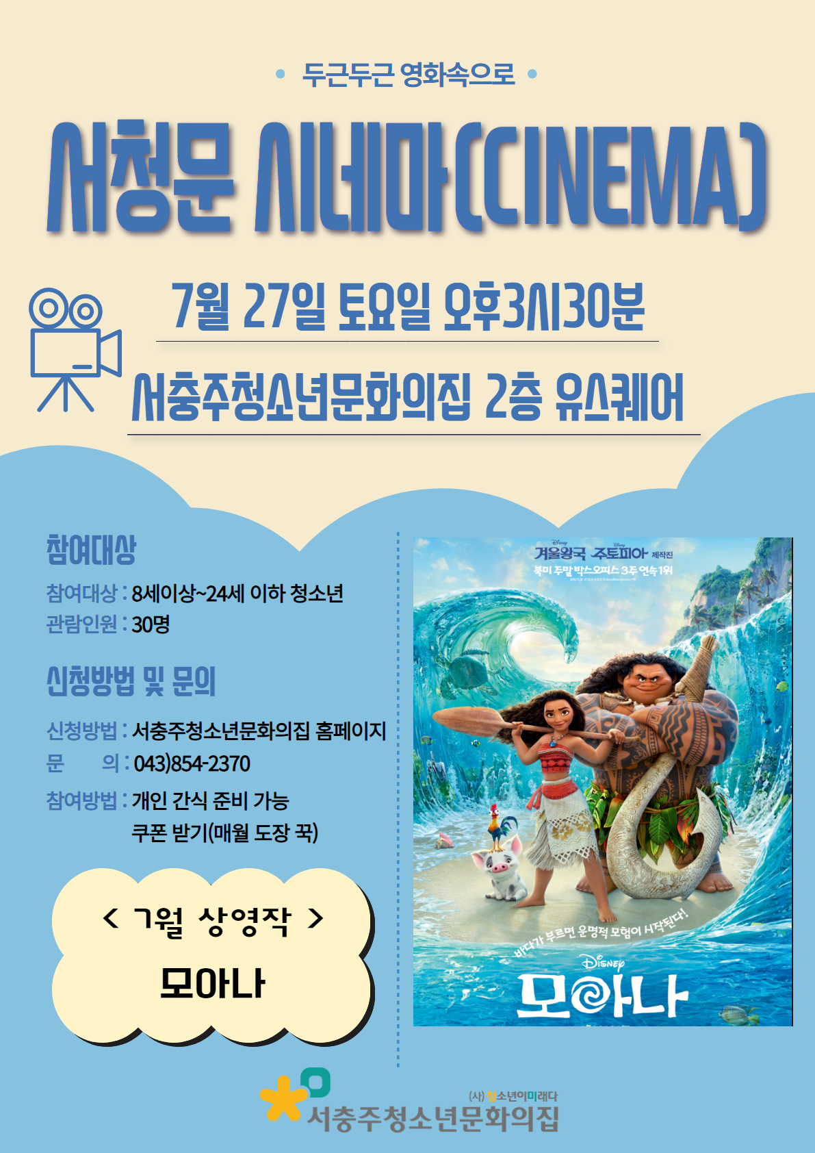 2024년 7월 문화의 날 “서청문 시네마(CINEMA)” 11월에 "모아나 2" 가 개봉된다는 사실! 알고 계신가요~? 그래서 이번에 친구들 추천으로 선정된 7월에 만날 상영작은 “모아나”입니다. 7월 27일 토요일(15:30~) 서충주청소년문화의집 2층 유스퀘어에서 청소년 여러분을 기다립니다~!