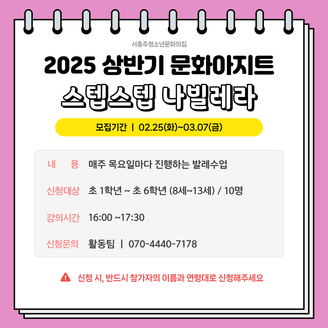 2025년도 상반기 문화아지트 <스텝스텝 나빌레라(발레)>수업입니다 ! * 수업 일정 - 1회기: 03.13 (목) - 2회기: 03.20 (목) - 3회기: 03.27 (목) - 4회기: 04.03 (목) - 5회기: 04.10 (목) - 6회기: 04.17 (목) - 7회기: 04.24 (목) - 8회기: 05.08 (목) - 9회기: 05.15 (목) - 10회기: 05.22 (목) - 11회기: 05.29 (목) ***** 필독 ***** - 참가비: 20,000원 - 참가비 입금 계좌: 농협/301-0331-2232-01/서충주청소년문화의집 - 신청과 입금 완료 후 기관으로 전화주셔야 <최종 신청 완료>됩니다! - 입금 후에는 환불이 어려우니 신중하게 고민 후 신청해주세요! (폐강 시에는 환불) - 입금은 신청자(청소년) 이름으로 입금해주셔야 확인이 더 빠릅니다! - 원활한 입금 확인을 위하여 입금 후, 070-4440-7178로 전화바랍니다! - 참가자 정원 60% 미만 시, 폐강될 수 있습니다. |