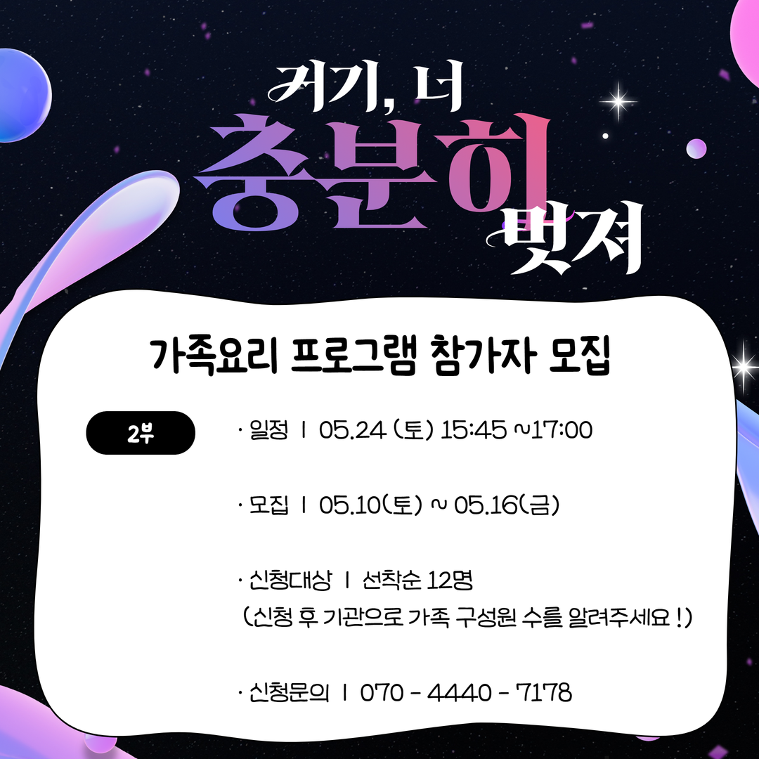 프로그램명 2025 거기, 너 충분히 멋져 "가족요리 프로그램 참가자 모집 (2부)" 교육기간 2025-05-24 ~ 2025-05-24 / 토 / 15:45~17:00 접수기간 [ 온라인 / 선착순 ] 2025-05-10 09:24 ~ 2025-05-21 23:59 모집연령 및 정원 8 ~ 24세 결과발표회 참가자 가족 우선 / 6명 (예비 1명) 프로그램문의 070-4440-7178 수업 내용 안녕하세요 서충주청소년문화의집입니다 ! 05.24 (토) 가정의 달을 맞이하여공연 및 프로그램을 준비하게 되었습니다 ><✓ 일시 : 05. 24 (토) / 14:30 ~ 15:45✓ 장소 : 서충주청소년문화의집 2층✓ 신청대상 : 청소년 가족 선착순 12명* 신청 후 기관으로 가족 구성원 수를 알려주세요 !* 공지사항 *- 신청은 반드시 참가자(청소년)의 이름과 연령대로 신청 바랍니다.많은 참가 부탁드립니다 ~!! 첨부파일 2.png [ Size : 750.12KB, Down : 48 ] 미리보기 다운로드 ※ 프로그램 신청 시 대상연령 확인 후 관리자 승인까지 완료되어야 프로그램 신청인원으로 카운트됩니다. 신청확인 목록보기
