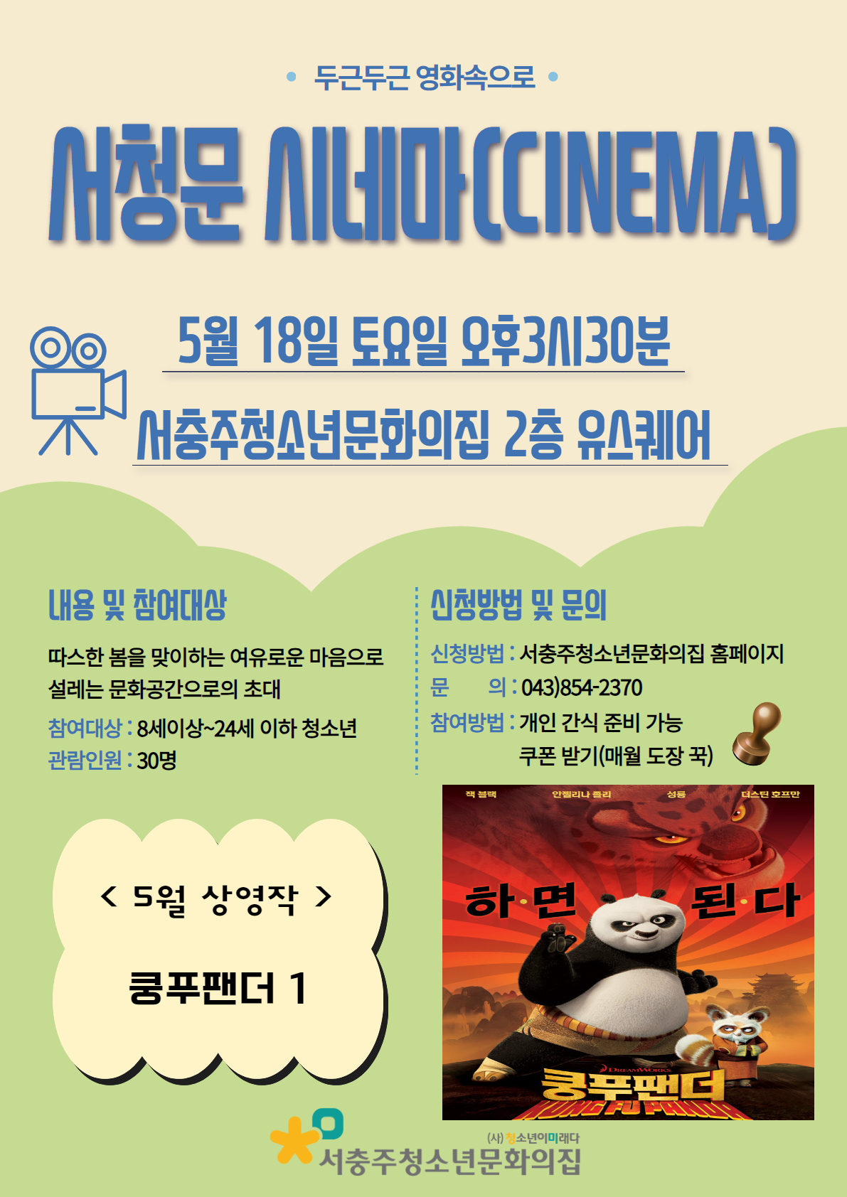 2024년 5월 문화의 날 “서청문 시네마(CINEMA)” 5월 18일 토요일(15:30~) 서충주청소년문화의집 2층 유스퀘어에서 청소년 여러분을 기다립니다~! 친구들 추천으로 선정된 5월에 만날 상영작은 “쿵푸팬더 1”입니다. |