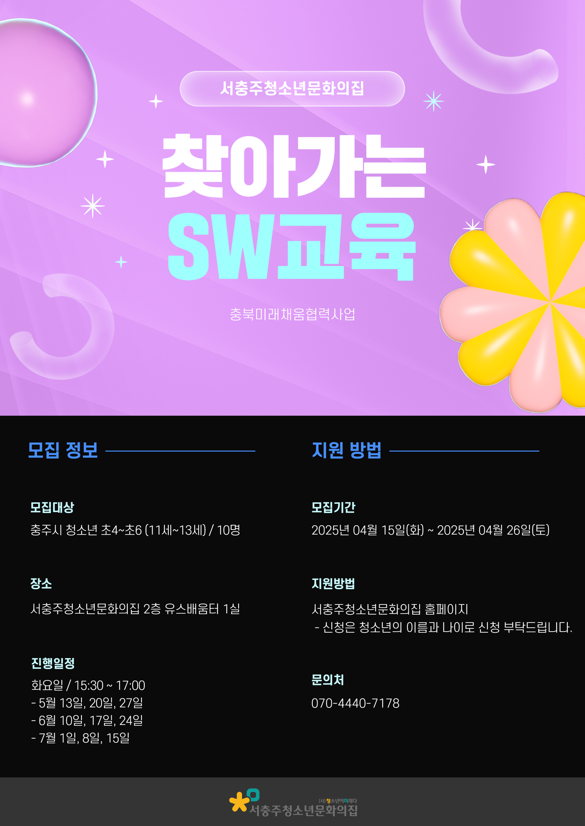 2025년 찾아가는 SW교육 <고학년반> * 수업 일정 - 1회기: 05.13 (화) - 2회기: 05.20 (화) - 3회기: 05.27 (화) - 4회기: 06.10 (화) - 5회기: 06.17 (화) - 6회기: 06.24 (화) - 7회기: 07.01 (화) - 8회기: 07.08 (화) - 9회기: 07.15 (화) * 수업 안내 - 엔트리 기초 - 어썸봇 장기자랑 코딩 - 마이크로비트 ***** 필독 ***** - 신청은 반드시 참가자의 이름과 나이로 신청 부탁드립니다. - 강사님의 개인사정에 따라 날짜가 변동될 수 있습니다. - 무단결석 3회 시 다른 프로그램에서 제외될 수 있습니다. - 참가자 정원 60% 미만 시, 폐강될 수 있습니다. |