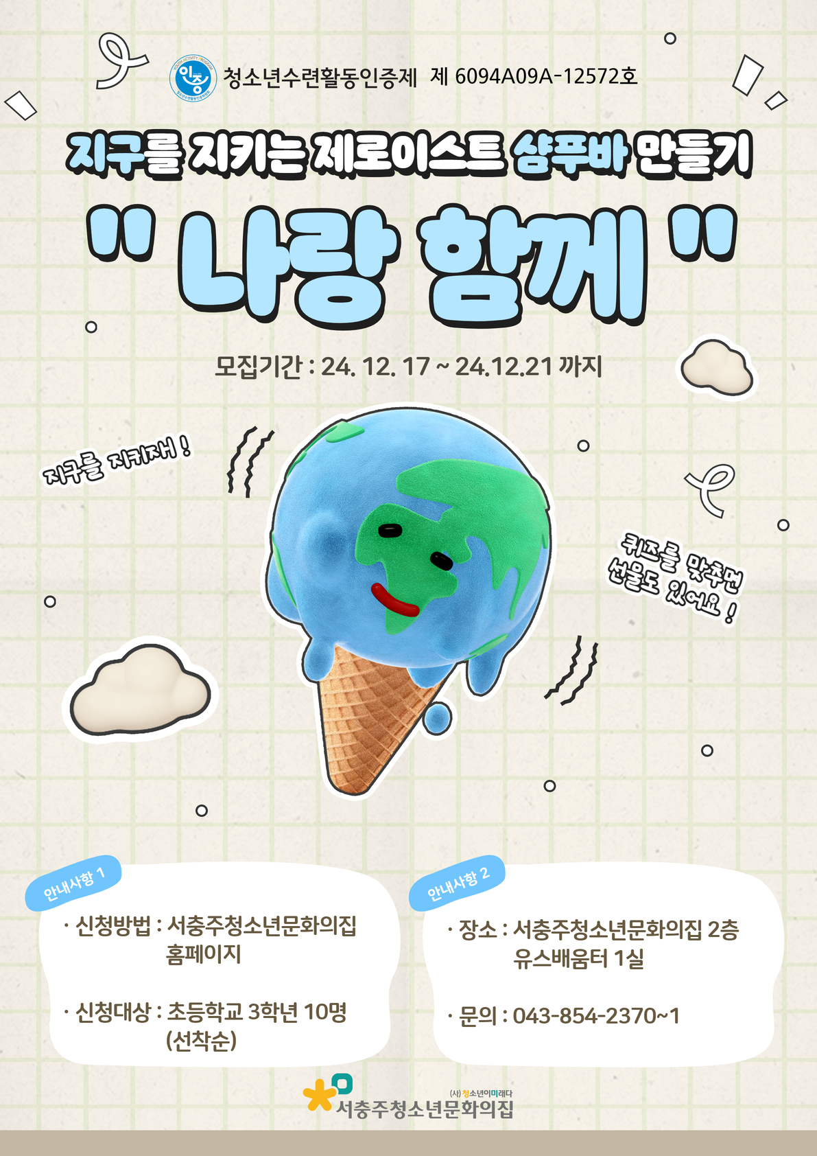 안녕하세요 서충주청소년문화의집입니다! ✔ 청소년수련활동인증제란? "청소년활동진흥법 제35조에 따라 청소년이 안전하고 유익한 청소년활동에 참여할 수 있도록 일정기준에 따라 심시해 프로그램을 인증하고, 프로그램에 참여한 청소년의 활동 기록을 유지·관리·제공하는 국가 인증제도" 그만큼 안전하고 유익하다는 뜻!!! ✨ ✔ 일자: 2024. 12. 28.(토) 10:00~12:00 ✔ 모집기간: 2024. 12. 17.(화) ~ 21.(토)까지 ✔ 대상: 10세 청소년 10명 ✔ 장소: 서충주청소년문화의집 2층 유스배움터 1싷 ✔ 신청: 서충주청소년문화의집 홈페이지 |
