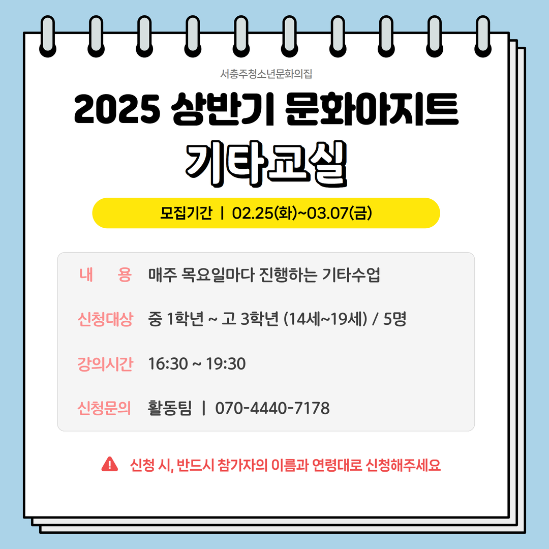 2025년도 상반기 문화아지트 <기타교실 (기타)>수업입니다 ! * 수업 일정 - 1회기: 03.13 (목) - 2회기: 03.20 (목) - 3회기: 03.27 (목) - 4회기: 04.03 (목) - 5회기: 04.10 (목) - 6회기: 04.17 (목) - 7회기: 04.24 (목) - 8회기: 05.08 (목) - 9회기: 05.15 (목) - 10회기: 05.22 (목) - 11회기: 05.29 (목) ***** 필독 ***** - 참가비: 20,000원 - 참가비 입금 계좌: 농협/301-0331-2232-01/서충주청소년문화의집 - 신청과 입금 완료 후 기관으로 전화주셔야 <최종 신청 완료>됩니다! - 입금 후에는 환불이 어려우니 신중하게 고민 후 신청해주세요! (폐강 시에는 환불) - 입금은 신청자(청소년) 이름으로 입금해주셔야 확인이 더 빠릅니다! - 원활한 입금 확인을 위하여 입금 후, 070-4440-7178로 전화바랍니다! - 참가자 정원 60% 미만 시, 폐강될 수 있습니다. |